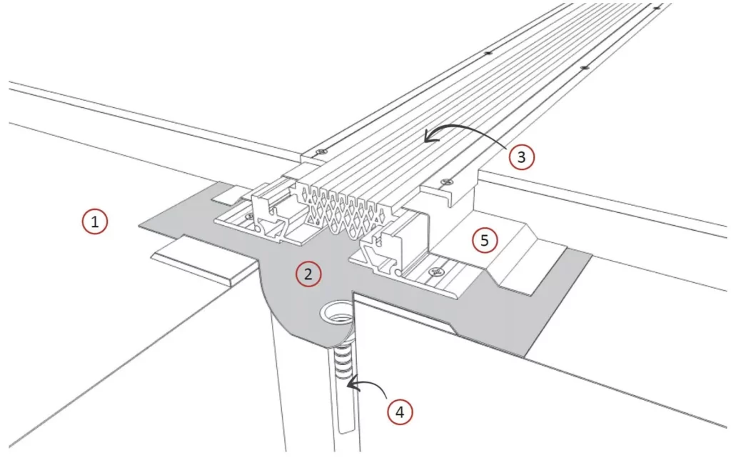(5) Waterproof membrane bonded to the sides of the expansion joint and cross-linked to the membrane bonded to the substrate forming a completely watertight envelope