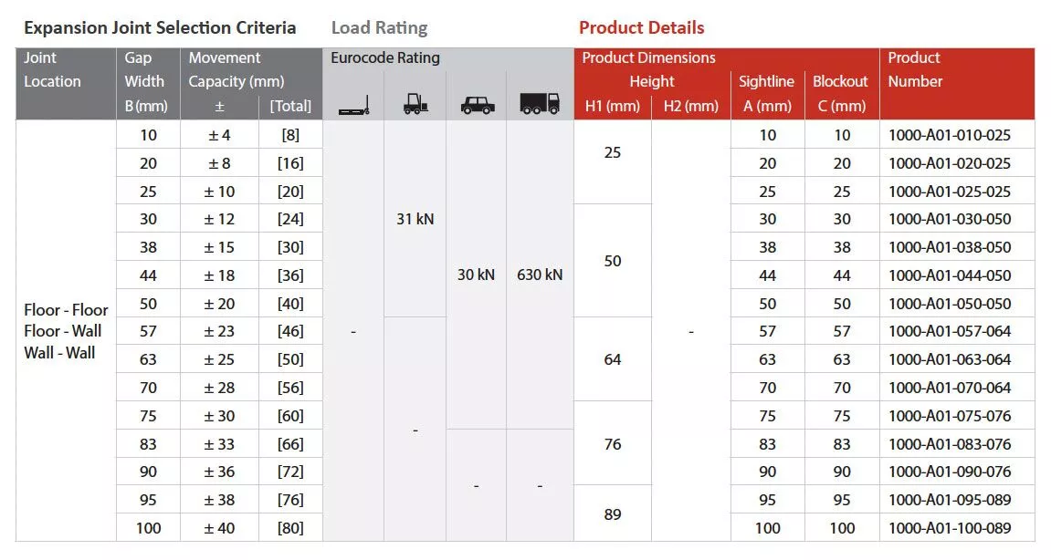 | Gap width(s) | 10, 20, 25, 30, 38, 44, 50, 57, 63, 70, 75, 83, 90, 95, 100 mm |
